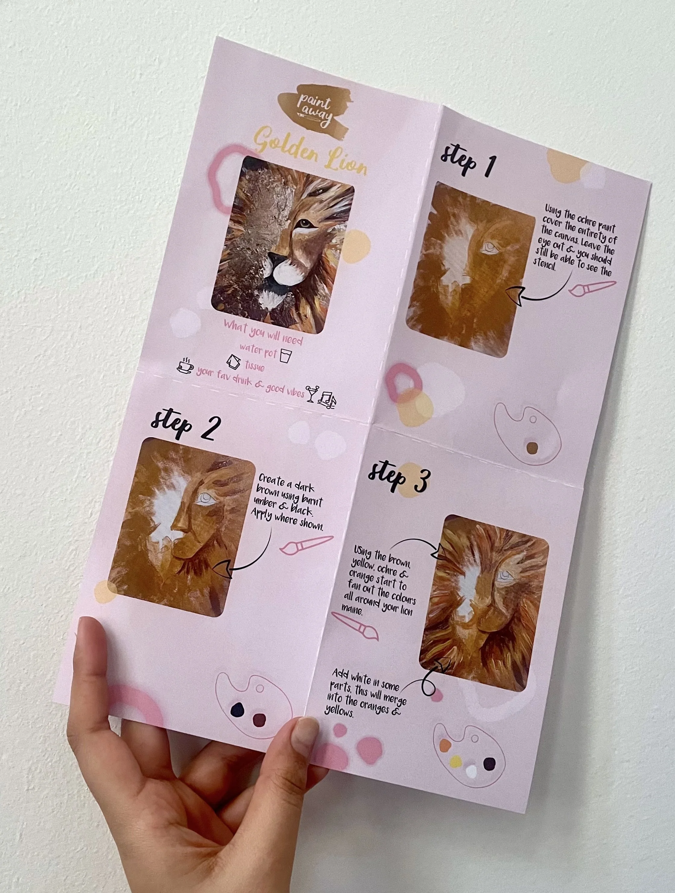 Paint Away Events offers art enthusiasts an engaging way to explore creativity from home with our curated paint-at-home kits. I have produced 7 of these guides for various paintings. They are made on A4 size layout double sided, which folds into A6. This provides ease for each box and for the customer.
